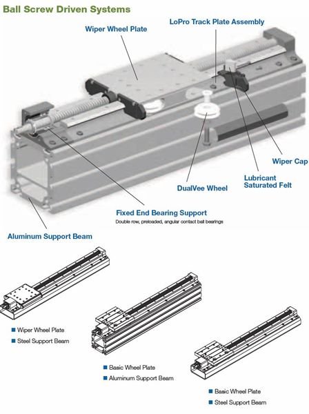 N/A Metric ball screw driven LoPro ball screw actuator systems are accurate to 0.004 in/ft (0.1 mm /300 mm). Ball screws are available in standard and corrosion resistant forms to meet environmental constraints. Basic or wiper wheel plates may be selected, as well as steel or aluminum support beams. |