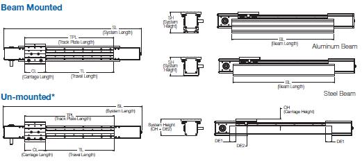 • Un-mounted systems are designed for mounting to a customer-supplied mounting surface. System straightness and flatness are determined by mounting surface accuracy. Continuous support along the entire track plate length and under drive end mounting surfaces is required.
