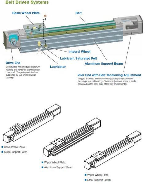N/A LoPro belt drives are ideal for long lengths and high speeds. Belt drives feature AT style reinforced polyurethane belting. Belt drive systems may be mounted to either steel or aluminum support beams, and come with your choice of wiper wheel plate or basic wheel plate. Corrosion resistant versions are available, as are multiple wheel plates.