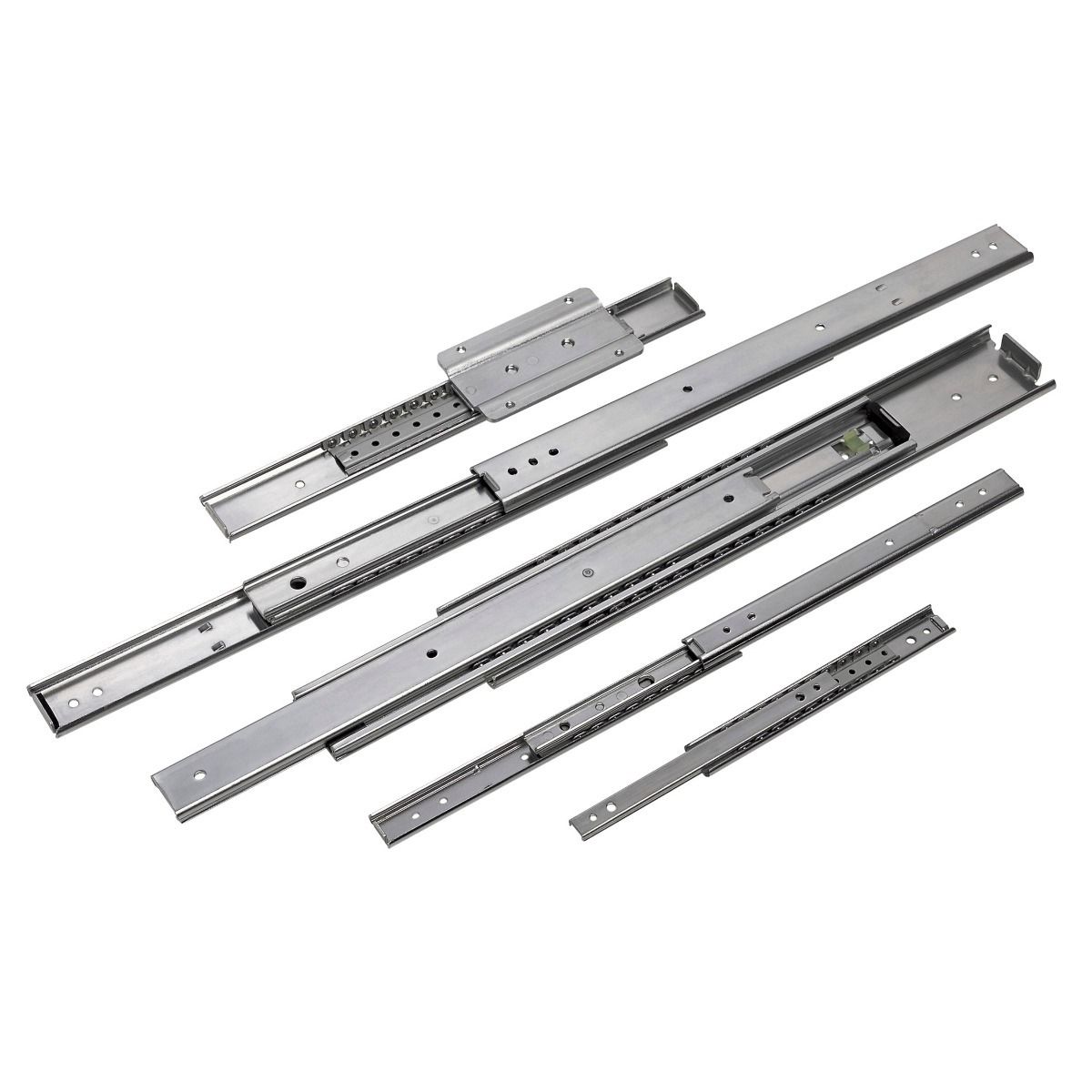 3/4 Travel Slides extend approximately 3/4 of the total slide length, for applications not requiring complete access to drawer/components. Over Travel Slides extend further than the length of the slide, allowing total and easy access to the drawer/components; often a convenient feature. Both Side Travel Slides extend in either direction, allowing access to drawer or components from either side of the cabinet. Linear Motion Slides contain an inner moving member, restricting movement to within the slide. Lever Disconnect actuates the latch so that the drawer can be removed. Lock-out locks the slide in the open position preventing accidental closure. |